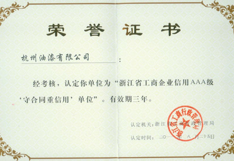 杭州油漆再获浙江省工商企业信用AAA级守合同重信用单位
