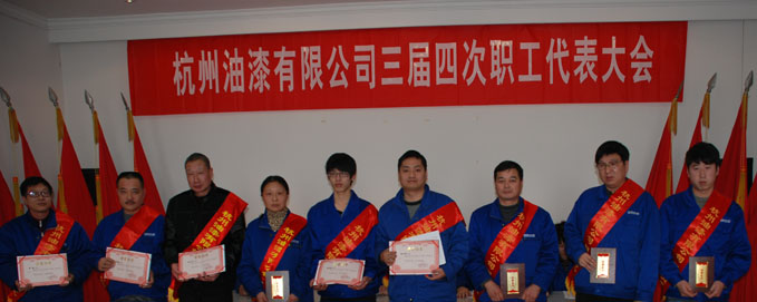 大会表彰了在2013年度生产、经营、技术、管理等岗位上涌现出的先进集体和优秀员工,他们有:(1)工业工会“工人先锋号”——制造部面漆工段调色组;(2)杭州市“工人先锋号”——质量保证部;(3)工业工会“职工创新工作室”——公司“功能性涂料创新工作室”;(4)系统“职业技能带头人”——阮建红、金庆强、张志国;(5)公司2013年度明星员工:阮建红、陈忠星、陆立峰、周源吉、杨瑞兴、高顺翔、张靖凯、陈敏、汪杰。